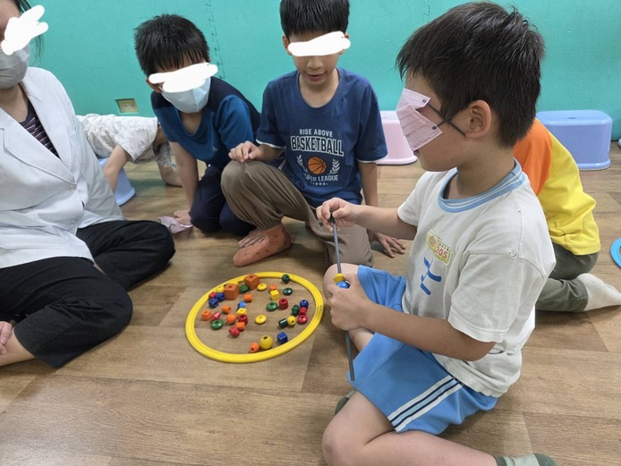 地上有不同顏色形狀的串珠,孩子兩人一組,一人矇眼、另一人指揮,找到對應題目的串珠顏色順序串起後,聽指令避開地上的障礙物,將成品放置指定位置。可以促進合作、溝通、信任、空間概念、聽覺指令理解、觸視覺發展等。