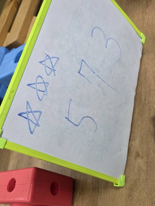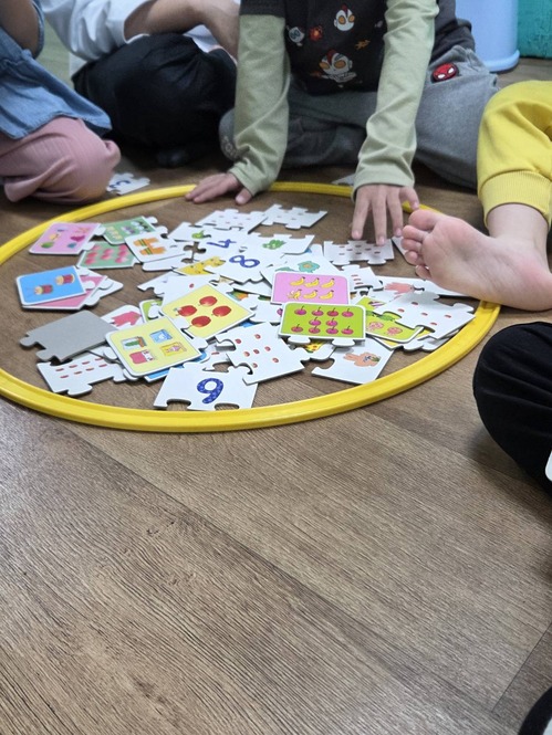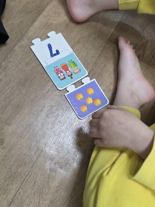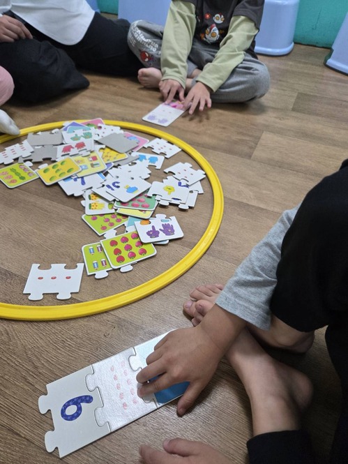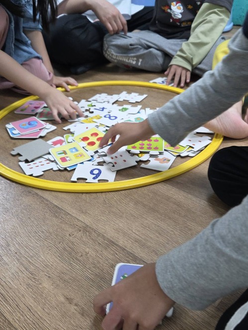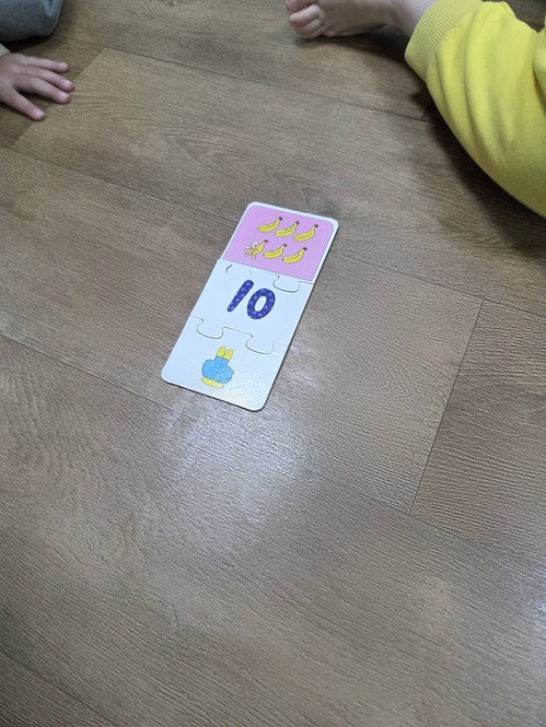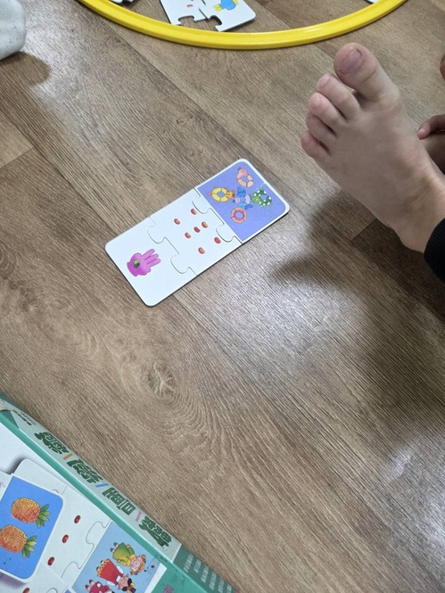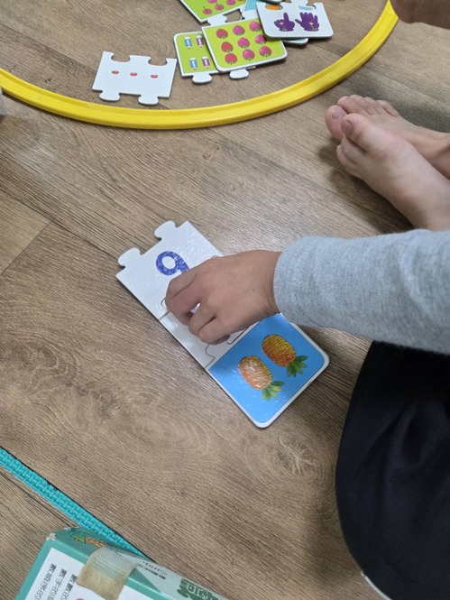 ●運用教具,出不一樣組合的數字題目,請孩子在拼圖中找到不一樣的種類及數量並合併成答案。