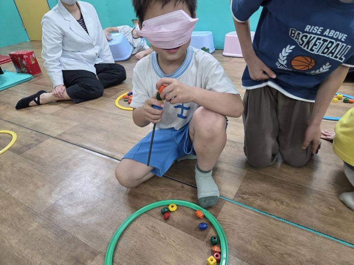 地上有不同顏色形狀的串珠,孩子兩人一組,一人矇眼、另一人指揮,找到對應題目的串珠顏色順序串起後,聽指令避開地上的障礙物,將成品放置指定位置。可以促進合作、溝通、信任、空間概念、聽覺指令理解、觸視覺發展等。