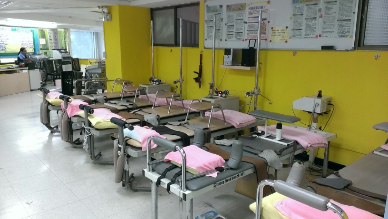 - 運動治療設備:跑步機、腳踏車、中風患者手腳運動機、垂直振盪儀(誘發肌力、減輕張力)、站立推拉箱、滑輪組、上肢肌力訓練設備、彈力帶組合、肩輪、指梯、行走平衡桿、蹲站支撐架、生物力學腳踝訓練板(BAPS)、下肢重力訓練儀、行走訓練使用樓梯、上肢/下肢等速肌力訓練儀、站立床、運動治療床。